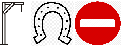 So was the answer as simple as “Greek?” Nope. Put those Greek letters in grid order – “ΠΙΚΤΟΓΡΑΜ” – and then transliterate back to the Roman alphabet and you get “PIKTOGRAM,” which looks and sounds suspiciously like an English word. Next, apply the “pictogram” concept to the grid’s three longest entries HANGMAN GALLOWS, HORSESHOE and DO NOT ENTER SIGN, in order: