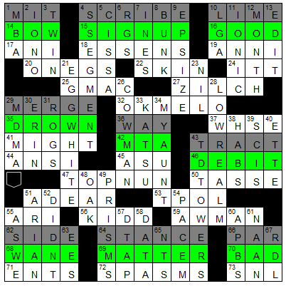 Wrong. The bottom bit of each triple decker was irrelevant, actually. Instead, all that was going on was that each entry lacking a clue could be clued by a word formed by adding the prefix “sub” to the entry above it – so, e.g., 14-across BOW could be clued as “submit” – and it sits in the grid under (or SUB) the entry MIT. And so on: