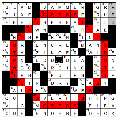 Last week I asked for a four-letter word in a puzzle called “show me a sign.” There were four long answers, but they didn’t seem very themey (because they weren’t.) But there was one clue with a *: 13d “Color of a ‘Spot’ on Jupiter” = RED. The idea here was to envision all the letters of the word “Stop” in the grid in red. A subtle hint, and a lot of solvers commented that they didn’t really forward-solve this puzzle; rather the puzzle title and the star on the clue for RED led to a guess that the answer would be STOP, which it was.