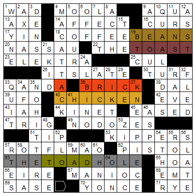[68a. Guitars, slangily] AXES (rhymes with “taxes”) intersected with 56d. NODES, whose clue, [Parts of a mathematical graph], also works for AXES (rhymes with “taxis”).