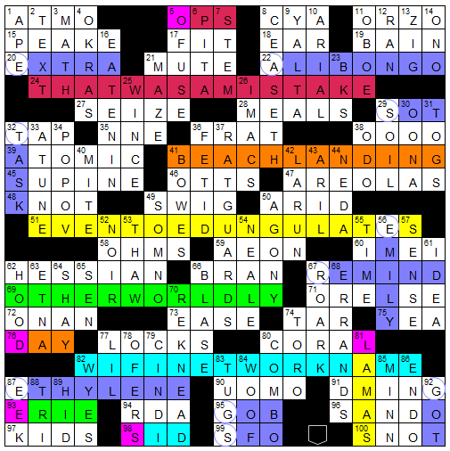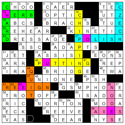 In order, those letters (the H in HERB, the O in POLISH, the U in PUTTING, the S in RESIGN, and the E in AXES) spell out the meta answer, HOUSE (which is also heteronymic – the noun rhymes with “Gauss,” the verb rhymes with “cows” – though it wouldn’t have worked very well as a theme entry here because its two meanings are basically the same thing, just different parts of speech).