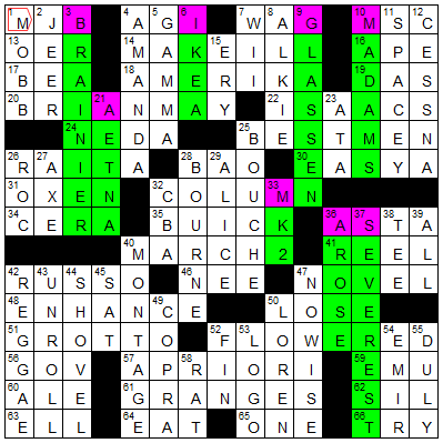[12a. Jazz trumpeter Alpert] HERB (in which the H is pronounced) intersected with 1d. CHARD, whose clue, [Garden green], also works for HERB (with a silent H, so long as you’re not British – if this one was tricky for you, sorry old chap);